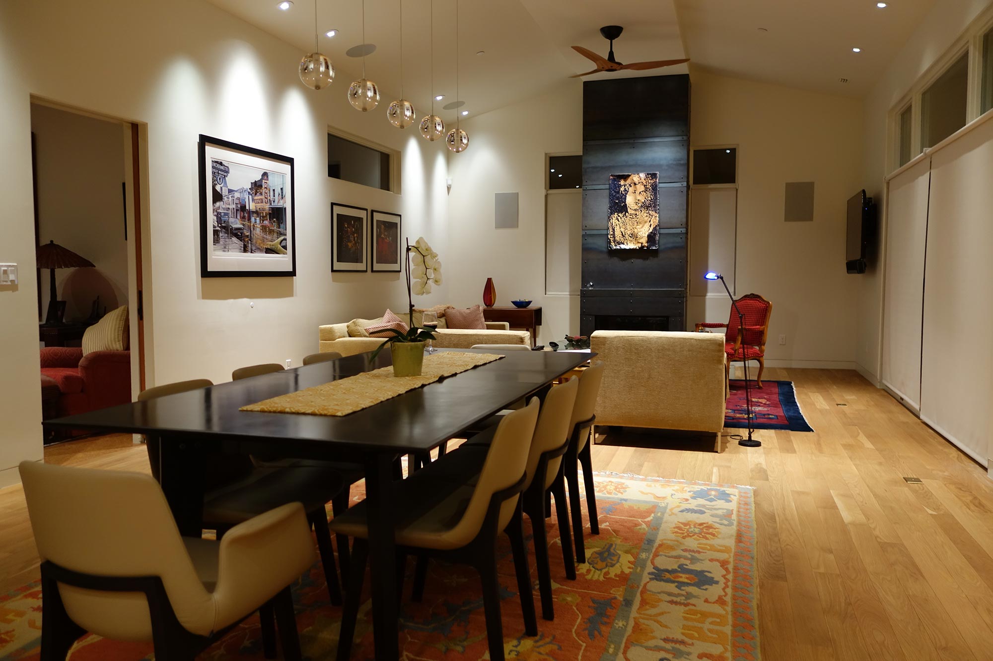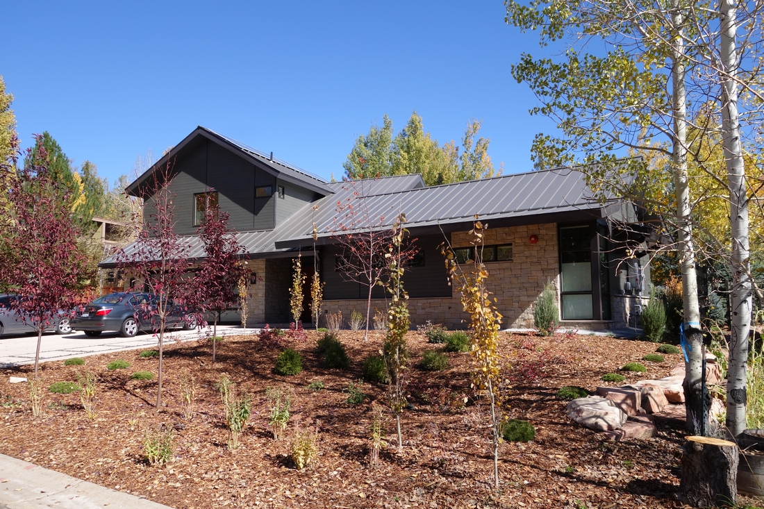 The empty-nesters required a floor plan that could efficiently accommodate two individuals while also providing space for out-of-town guests. The design of the home focused on enabling the owners to ‘age in place.’ The three upstairs suites have separate heating/cooling systems, allowing them to be easily shut off when unoccupied. Furthermore, the deep eaves and L-shaped building structure provide protection against the elements, while the back patio can be enjoyed throughout the year. The low-maintenance xeriscaping in the yard suits the needs of the owners, who frequently split their time between Park City and California, and are therefore often away for extended periods.